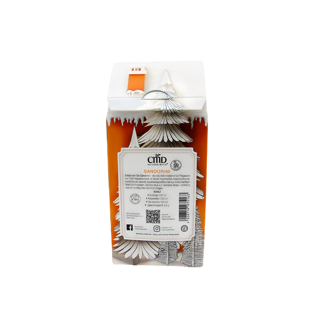 Die harmonische Kombination aus Sandorini-Duschgel, Körperlotion, Handcreme und Lippenpflegestift entfaltet einen fruchtig-frischen Duft, weckt winterliche Stimmung und bietet zugleich wirksame Pflege für die kalte Jahreszeit. Wertvolle Sanddornöle unterstützen die Hautregeneration, stärken die natürliche Feuchtigkeit und pflegen besonders bei Kälte und trockener Luft.