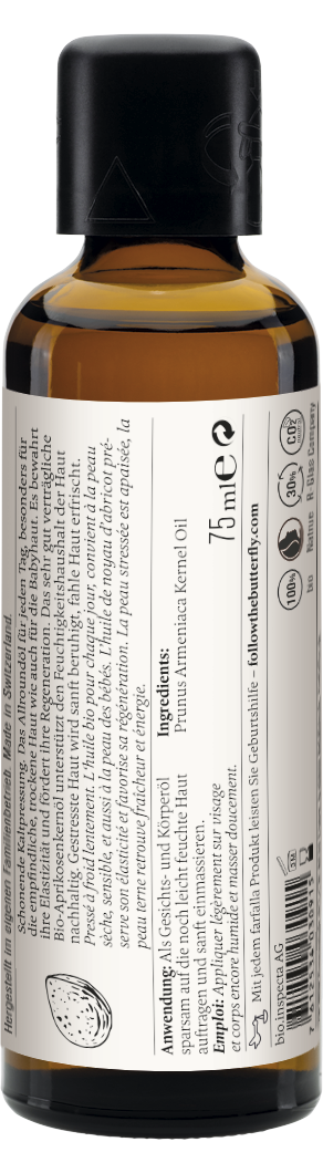 Das sehr gut verträgliche Bio-Aprikosenkernöl unterstützt den Feuchtigkeitshaushalt der Haut nachhaltig, bewahrt ihre Elastizität und fördert ihre Regeneration. Gestresste Haut wird sanft beruhigt, fahle Haut erfrischt und belebt.