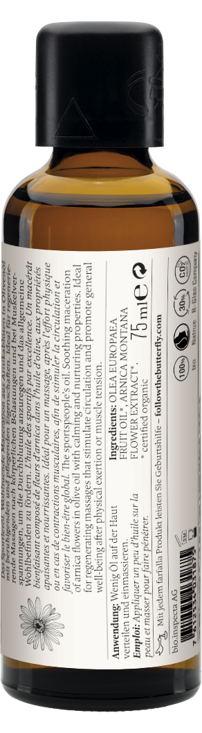 Wohltuende Mazeration aus Arnikablüten in Olivenöl mit beruhigenden und pflegenden Eigenschaften. Ideal für regenerierende Massagen nach körperlichen Belastungen und bei Muskelverspannungen, um die Durchblutung anzuregen und das allgemeine Wohlbefinden zu fördern.