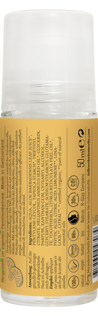 Für die überzeugende 24-h-Wirkung sorgt ein besonders hautpflegender naturkosmetischer Wirkkomplex, das spritzige ätherische Öl der Mandarine unterstützt die desodorierende Wirkung, belebt und beflügelt. Für ein sicheres und frisches Gefühl den ganzen Tag.