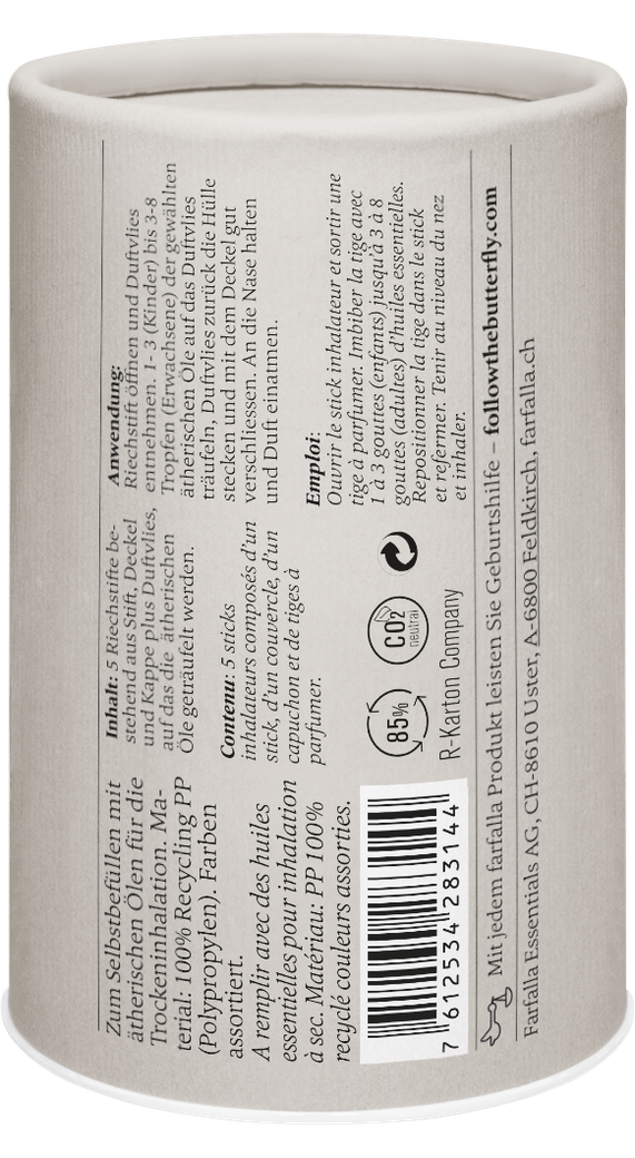 Anwendung: Riechstift öffnen und Duftflies entnehmen. 1- 3 (Kinder) bis 3-8 Tropfen (Erwachsene) der gewählten ätherischen Öle auf das Duftvlies träufeln, Duftvlies zurück die Hülle stecken und mit dem Deckel gut verschliessen. An die Nase halten und Duft einatmen. Nachhaltigkeitstipp: Nach der Einsatzdauer von einigen Monaten kann der Riechstift recycelt werden. Mit einem scharfen Gegenstand lässt sich der Deckel des Riechstifts wieder öffnen (auf eigene Gefahr). Nun den Riechstift mit Wasser und etwas Spülmittel reinigen und gründlich trocknen lassen. Nun kann er mit den "Ersatzstäbchen für Riechstift metall" oder einem Streifen Wattepad frisch befüllt werden.