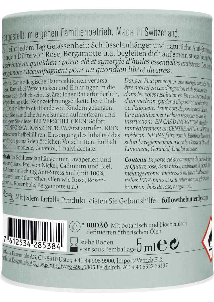 Inhalt: Schlüsselanhänger mit Lavaperlen und Rosenquarz (frei von Nickel, Cadmium und Blei), Aromamischung Anti-Stress 5ml (mit 100% naturreinen ätherischen Ölen wie Rose, Rosengeranie, Rosenholz, Bergamotte u.a.).