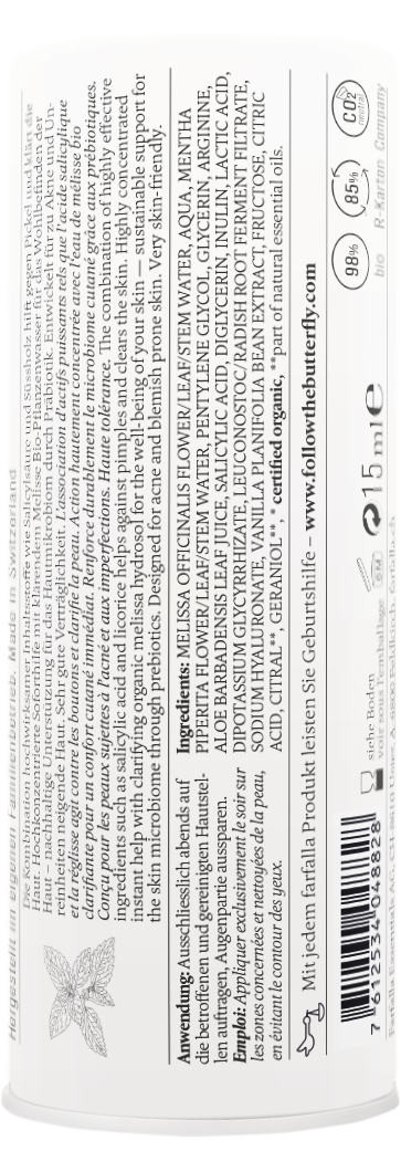 Inhaltsstoffe: MELISSA OFFICINALIS FLOWER/LEAF/STEM WATER*, AQUA, MENTHA PIPERITA FLOWER/LEAF/STEM WATER*, PENTYLENE GLYCOL, GLYCERIN, ARGININE, ALOE BARBADENSIS LEAF JUICE*, SALICYLIC ACID, DIGLYCERIN, INULIN, LACTIC ACID, DIPOTASSIUM GLYCYRRHIZATE, LEUCONOSTOC/RADISH ROOT FERMENT FILTRATE, SODIUM HYALURONATE, VANILLA PLANIFOLIA BEAN EXTRACT*, FRUCTOSE, CITRIC ACID, CITRAL**, GERANIOL**. * certified organic, **part of natural essential oils.