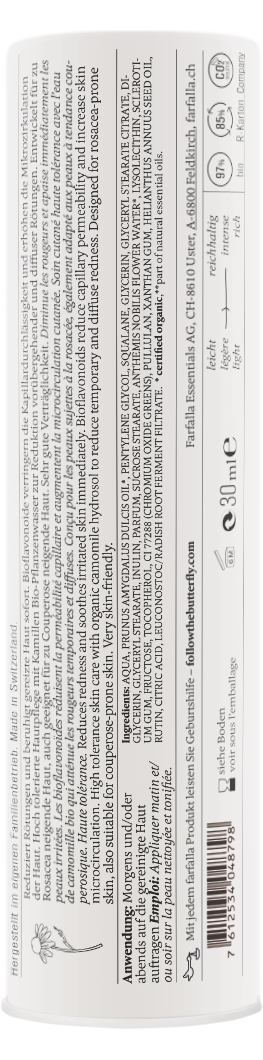 Bioflavonoide verringern die Kapillardurchlässigkeit und erhöhen die Mikrozirkulation der Haut. Hoch tolerierte Hautpflege zur Reduktion vorübergehender und diffuser Rötungen. Entwickelt für zu Rosacea neigende Haut, auch geeignet für zu Couperose neigende Haut. Sehr gute Verträglichkeit.