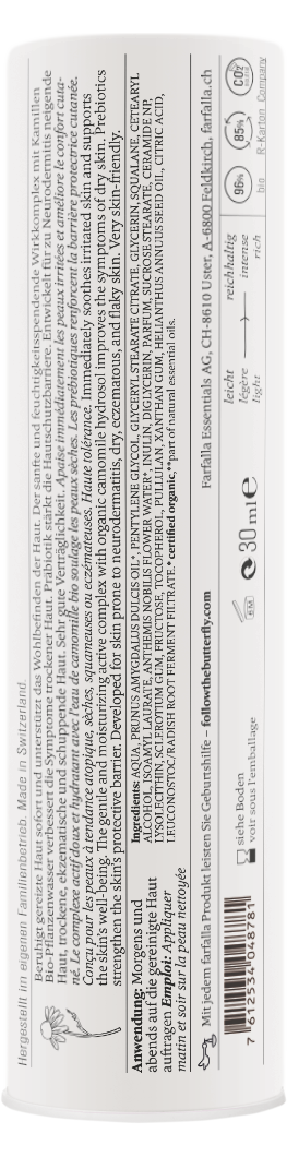 Der sanfte und feuchtigkeitsspendende Wirkkomplex verbessert die Symptome trockener Haut. Präbiotik stärkt die Hautschutzbarriere. Entwickelt für zu Neurodermitis neigende Haut, trockene, ekzematische und schuppende Haut. Hypoallergen, sehr gute Verträglichkeit.