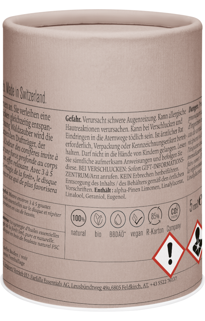 Inhalt: 1 x Aromamischung Waldzauber 5ml, mit naturreinen ätherischen Ölen. 1x naturbelassene Birkenholzscheibe FSC.