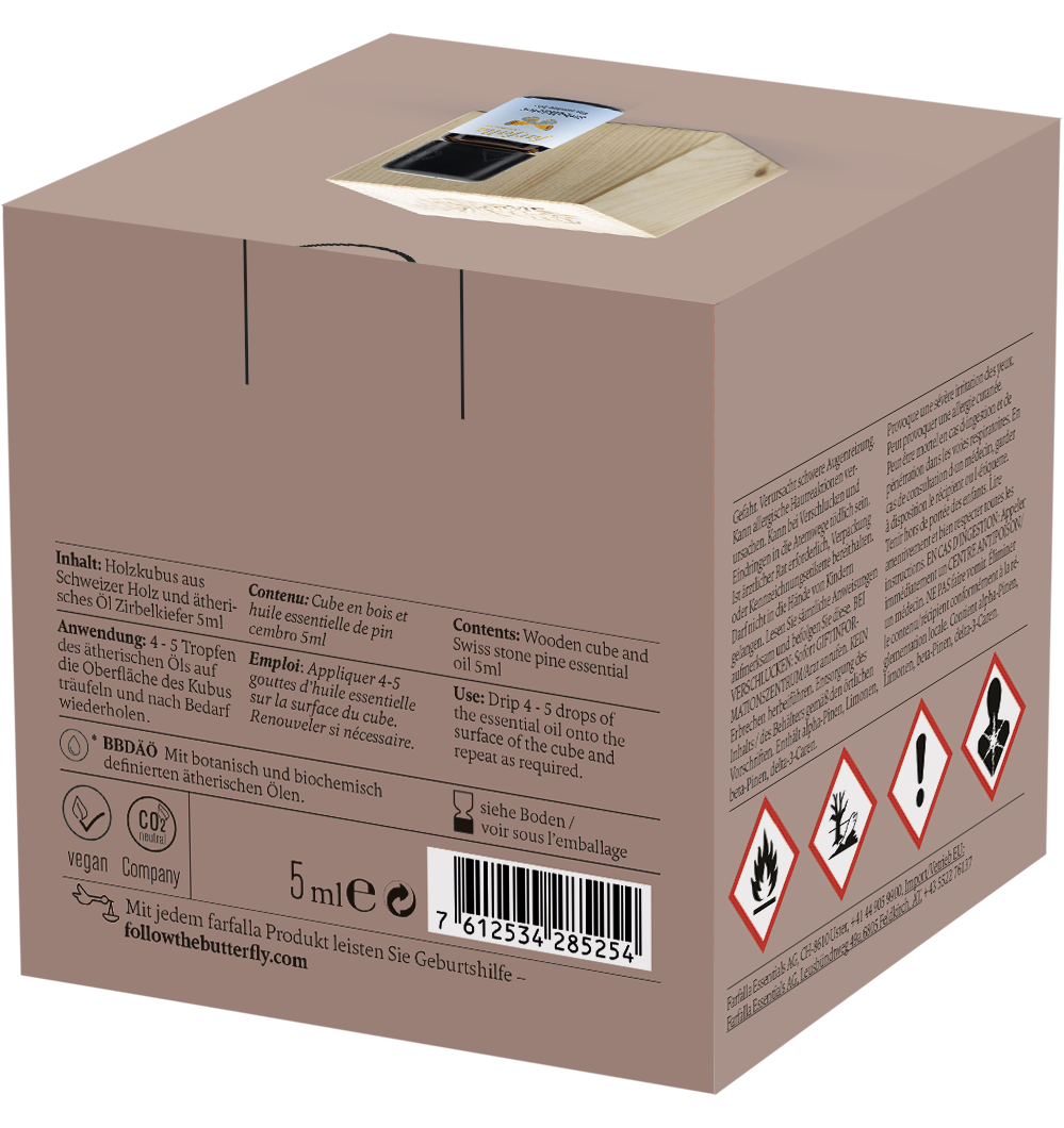 Inhalt: Holzkubus aus Schweizer Holz und ätherisches Öl Zirbelkiefer 5ml.