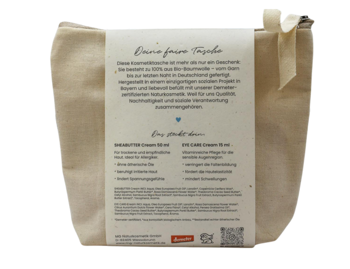 Hergestellt in einem einzigartigen sozialen Projekt in Bayern und liebevoll befüllt mit unserer Demeter-zertifizierten Naturkosmetik. Weil für uns Qualität, Nachhaltigkeit und soziale Verantwortung zusammengehören. Demeter-zertifizierte Naturkosmetik fair und nachhaltig verpackt.