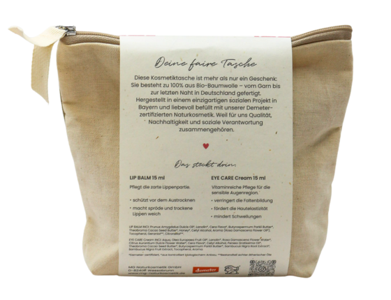 Diese Kosmetiktasche ist mehr als nur ein Geschenk! Sie besteht zu 100% aus Bio-Baumwolle – vom Garn bis zur letzten Naht in Deutschland gefertigt.