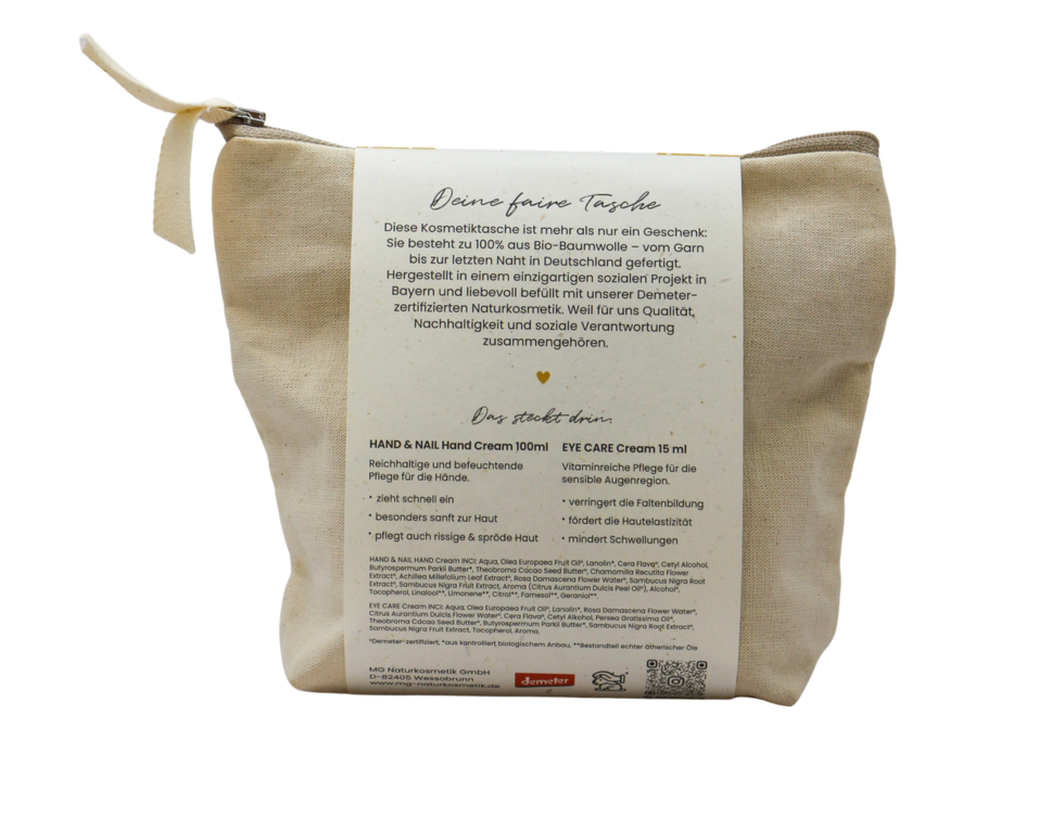 Hergestellt in einem einzigartigen sozialen Projekt in Bayern und liebevoll befüllt mit unserer Demeter-zertifizierten Naturkosmetik. Weil für uns Qualität, Nachhaltigkeit und soziale Verantwortung zusammengehören. Demeter-zertifizierte Naturkosmetik fair und nachhaltig verpackt.